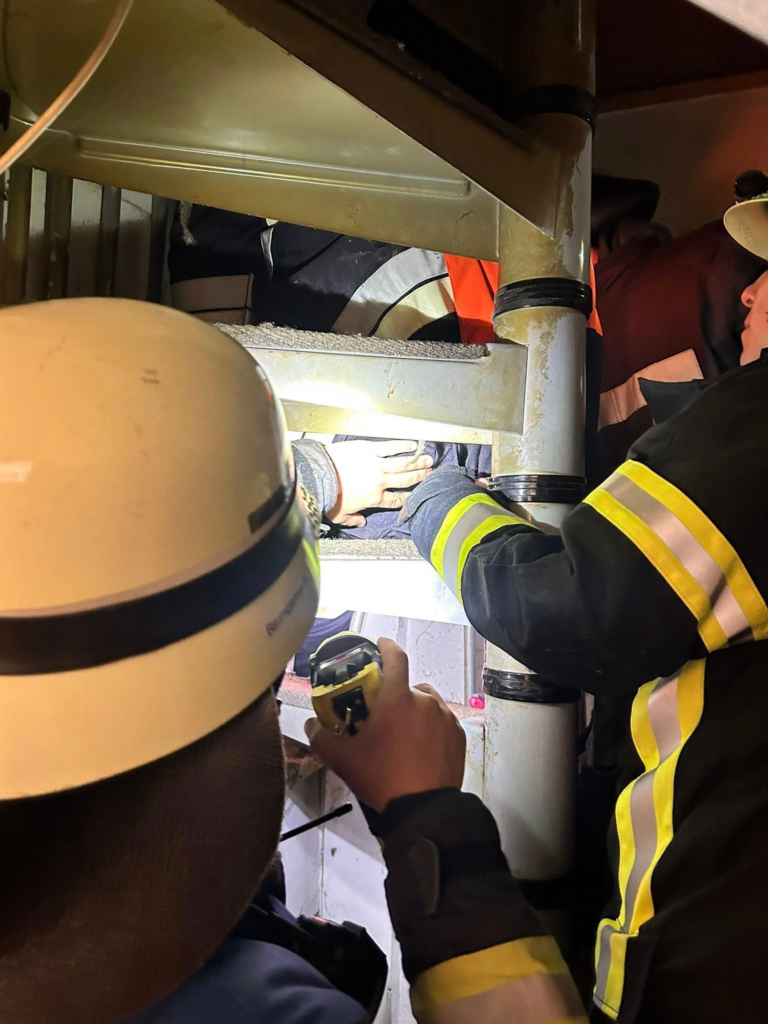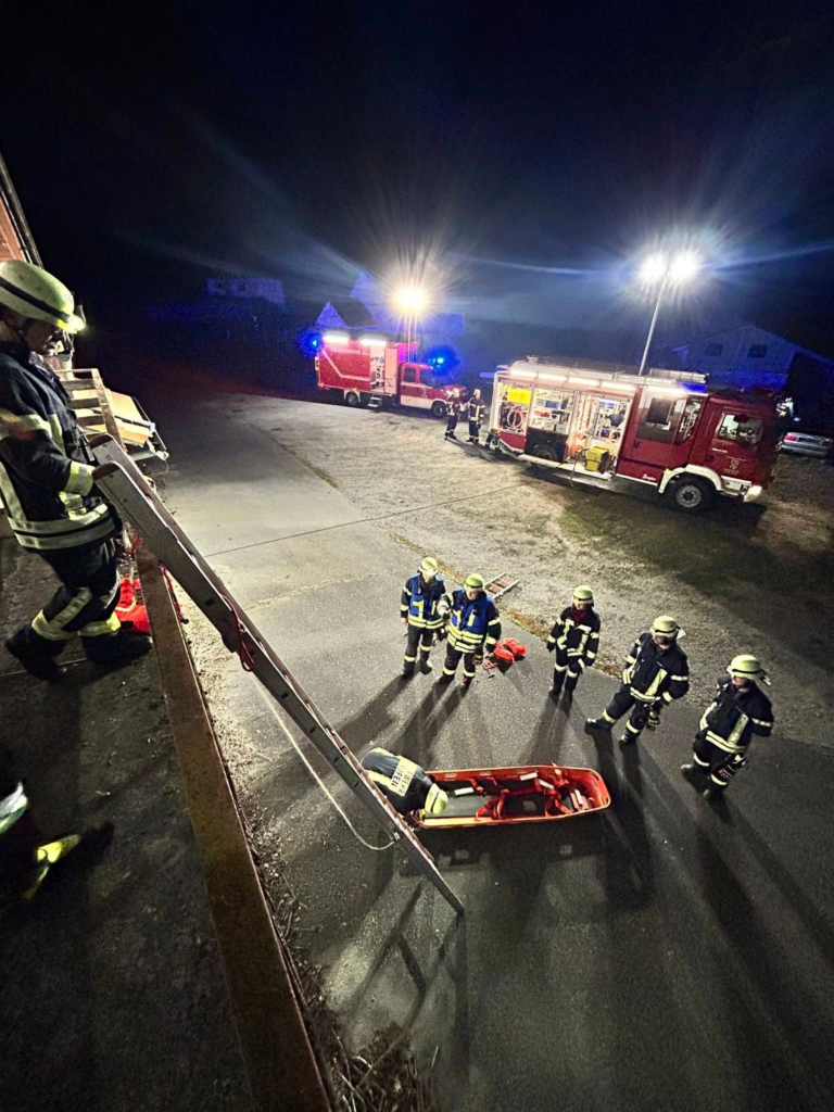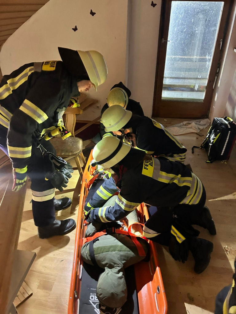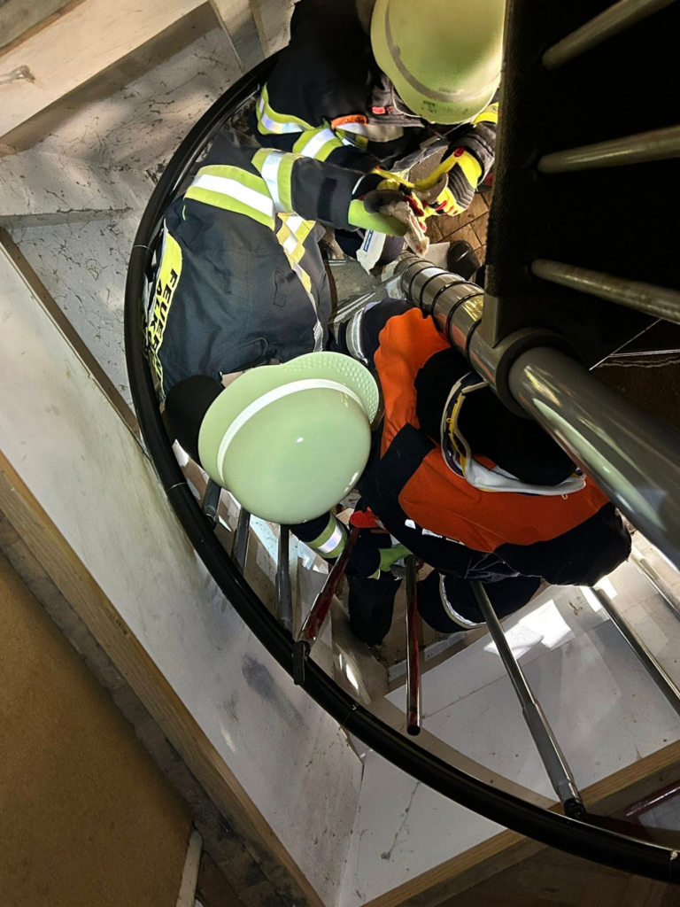 Teilweise waren die Übungspuppen in sehr ungünstigen Positionen eingeschlossen oder nur schwer erreichbar. Mit viel Teamarbeit, präziser Abstimmung und handwerklichem Geschick gelang es, beide Patienten über Leitern, durch enge Räume und auf verschiedenen Wegen sicher zu retten.
