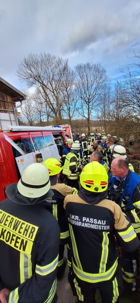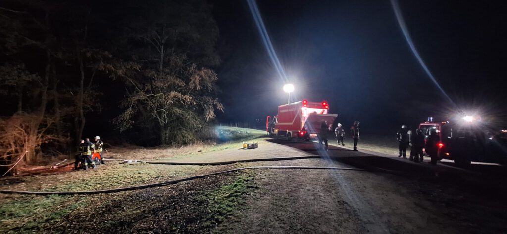 Erstmals im Einsatz war auch der neue Gerätewagen Logistik – und dieser konnte seine vorgesehenen Aufgaben voll erfüllen. Zunächst wurde die Tragkraftspritze an der Wasserentnahme an der Vils in Betrieb genommen. Im weiteren Verlauf unterstützte die Besatzung bei der Brandbekämpfung, beim Ausleuchten der Einsatzstelle sowie bei der Logistik von Schläuchen und Atemschutzgeräten.